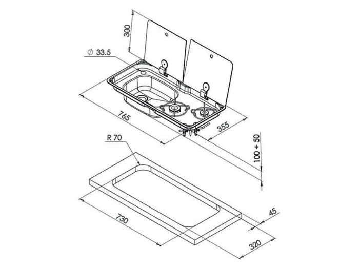 Le combiné plan de cuisson à 2 brûleurs avec évier CAN est une plaque de cuisson rectangulaire à gaz avec un évier rectangulaire, divisé en 2 parties avec 2 couvercles en verre. La plaque de cuisson est équipée de brûleurs avec couvercle à flamme autobloquant et équipée d’un thermocouple.