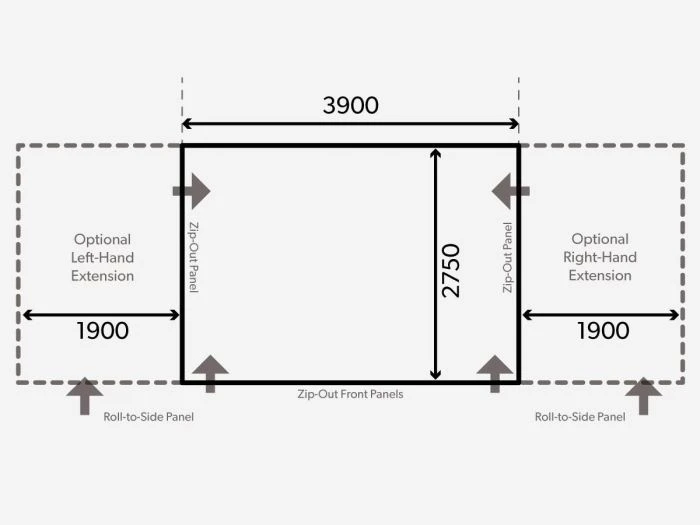L’auvent a une largeur de 390 cm. Cela signifie que la caravane doit avoir un rail droit d’au moins 390 cm afin de pouvoir monter l’auvent. Vous souhaitez glisser l’auvent dans le rail de votre store ? Dans ce cas, l’auvent doit avoir une longueur minimale de 400 cm.