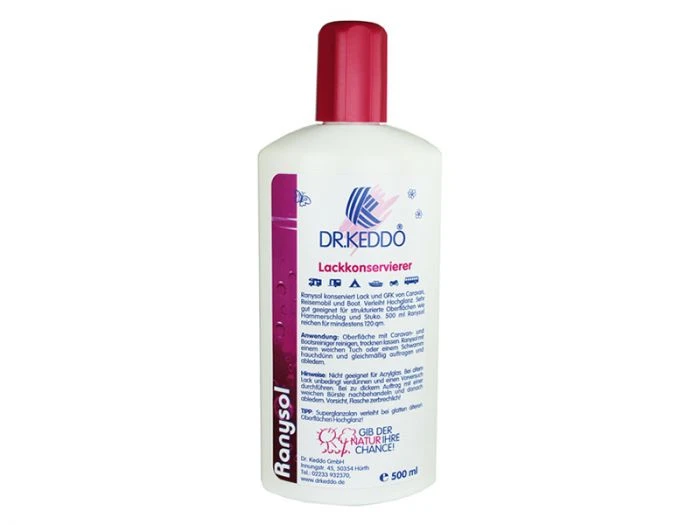 Le Dr. Keddo Ranysol protège la peinture et les surfaces en plastique de votre caravane, camping-car et bateau. Le Ranysol donne un bel éclat et protège contre la saleté.