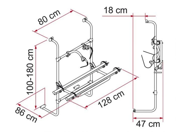 Ce porte-vélos convient pour maximum deux vélos, avec une capacité de charge maximale de 35 kg (17 kg par rail). Grâce à son cadre mural réglable (100-180 cm), ce porte-vélos est universellement applicable à différents types de caravanes.
