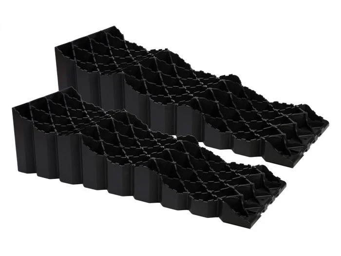 La partie supérieure de la cale roue est angulaire, offrant une adhérence optimale aux pneus en caoutchouc. La cale roue Tripple a une capacité de charge de 1500 kg par roue, donc le poids maximal pour une caravane est de 3000 kg et de 6000 kg pour un camping-car.