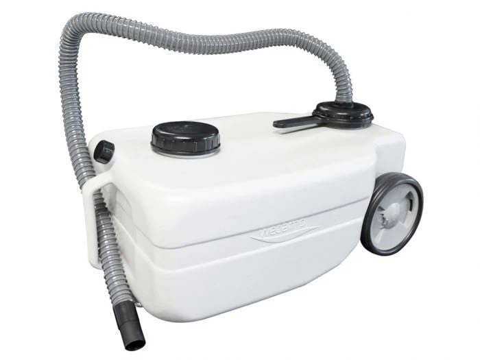 Réservoir d’eaux usées à 21 litres. Equipé d’une tube de vidange. Dimensions: 50 x 33,5 x 24 cm. Pourvu de roues et d’une poignée piable en acier.